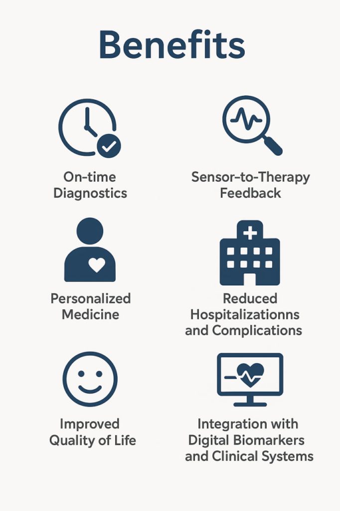 - On-time Diagnostics: implanted or wearable sensors collect real-time bio-signals: electrophysiological, biochemical, and molecular. This enables the detection of abnormalities before symptoms appear, greatly improving the effectiveness of treatment and prevention.