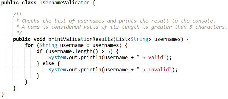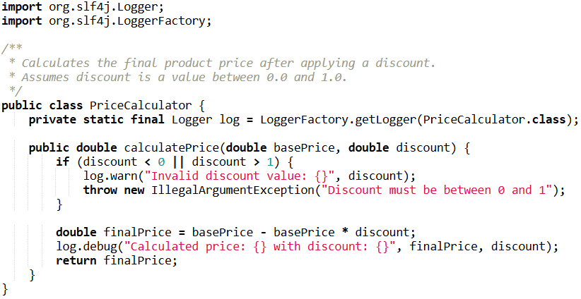 • Documentation: a short Javadoc before a method can save a lot of time. To keep things clean, there’s no need to rewrite the logic in words — just describe the method’s main purpose and clarify any non-obvious details if they exist.