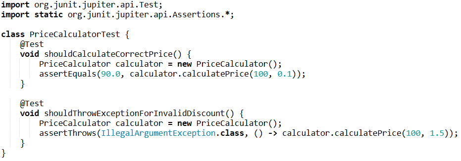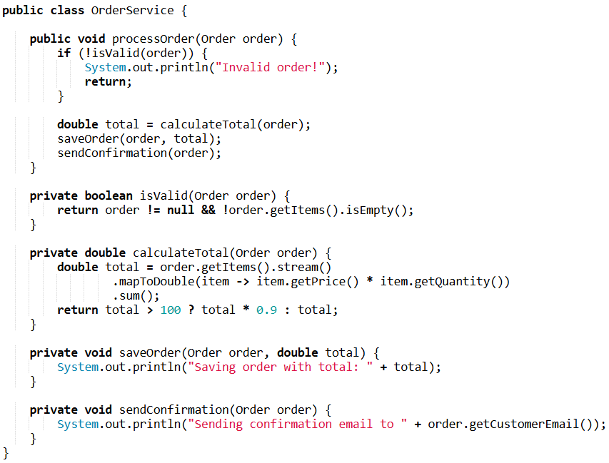 This structure makes the code clear, flexible, and easy to test. Even without comments, the logic remains obvious. You can modify the discount logic without affecting anything else, or test only calculateTotal() without dealing with other dependencies.