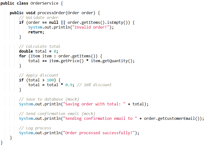 This method does everything at once — validation, calculation, discount, saving, email sending, and logging. Changing or testing just one part of it is nearly impossible without touching the rest.