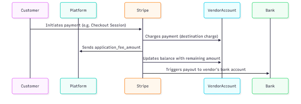 We went with a platform-managed payout flow using Stripe Express accounts. That meant each vendor needed their own Stripe account (created via our onboarding link), and we as the platform, acted as the middle layer that controlled the payment, fee deduction, transfer, and payout logic.